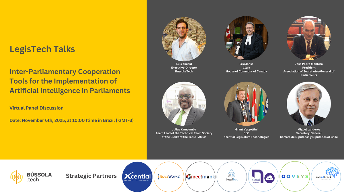 Bússola Tech is proud to host a high-level panel discussion on how inter-parliamentary cooperation can drive the implementation of Artificial Intelligence in legislative institutions. Titled “Inter-Parliamentary Cooperation Tools for the Implementation of Artificial Intelligence in Parliaments,” the session will explore how parliaments and parliamentary networks collaborate to share knowledge, build institutional capacity, and develop responsible frameworks for innovation.