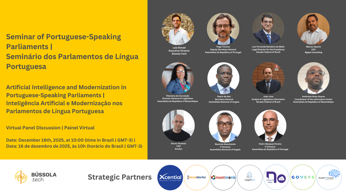 Bússola Tech is honoured to host a dedicated seminar on the modernization of Portuguese-Speaking Parliaments, bringing together senior institutional leaders and technical specialists to examine the evolving tools, practices, and governance models shaping the future of legislative institutions across the Lusophone world.